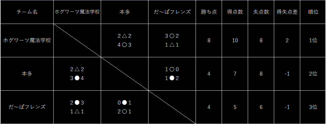top_slider partner PARTNERパートナー result RESULT 11/15 sat. 西東京予選① 大会結果 優勝 : ホグワーツ魔法学校 2位 : 本多 MVP : ホグワーツ魔法学校のフィールドプレーヤー選手 result RESULT西東京予選① 星取表 team TEAM西東京予選出場チーム ホグワーツ魔法学校 本多 だ~ばフレンズ photo PHOTO大会風景 partner PARTNERパートナー
