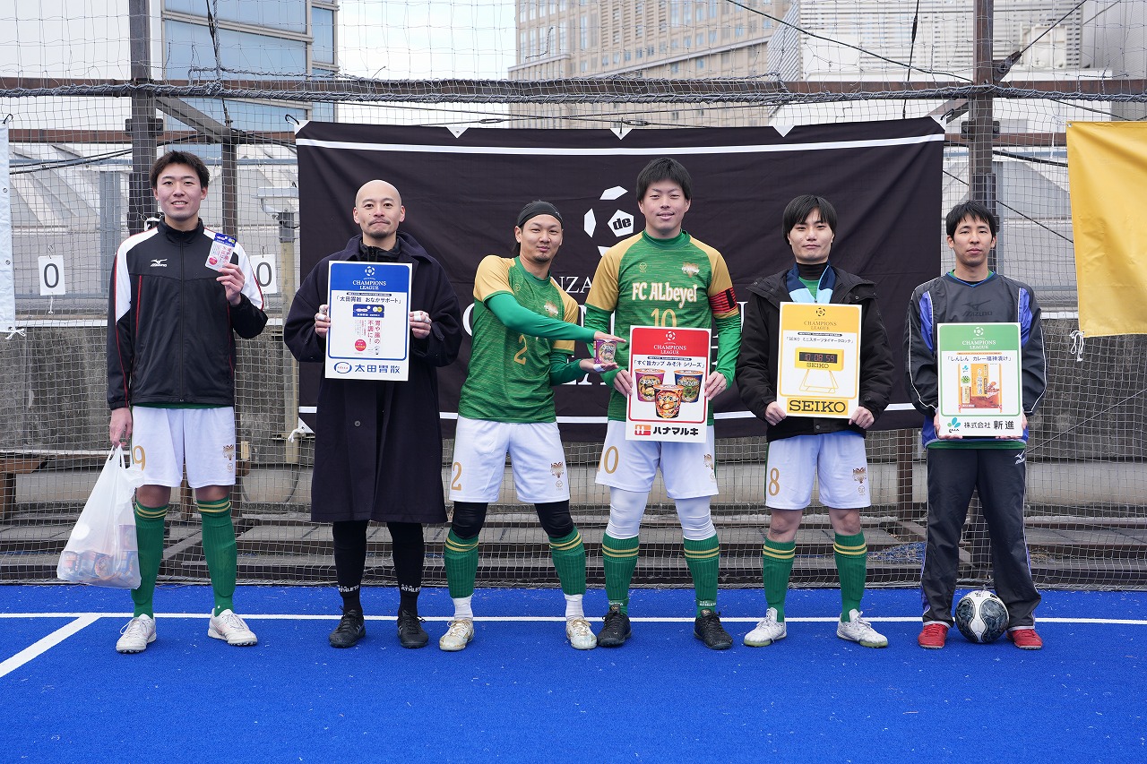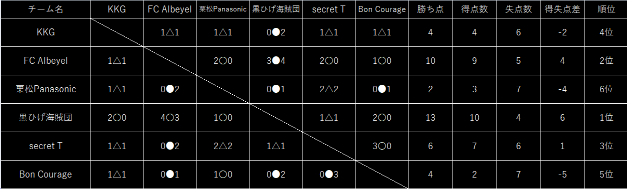 top_slider partner PARTNERパートナー result RESULT 12/13 sat. 川崎予選② 大会結果 優勝 : 黒ひげ海賊団 2位 : FC ALbeyel MVP : 黒ひげ海賊団のフィールドプレーヤー result RESULT川崎予選② 星取表 team TEAM川崎予選②出場チーム KKG FC ALbeyel 栗松Panasonic 黒ひげ海賊団 secret T Bon Courage photo PHOTO大会風景 partner PARTNERパートナー
