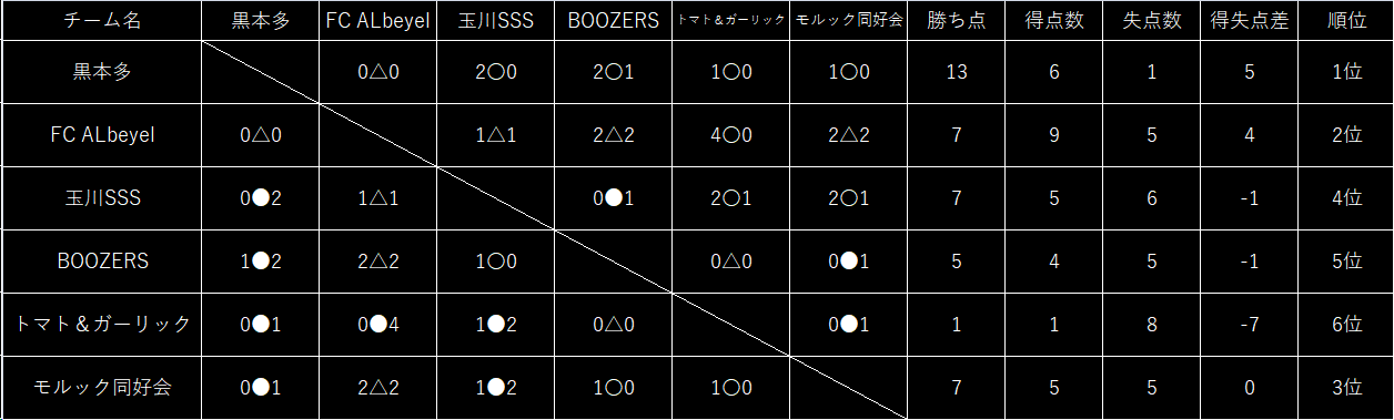top_slider partner PARTNERパートナー result RESULT 12/21 sun. 鶴見予選② 大会結果 優勝 : 黒本多 2位 : FC ALbeyel MVP : 黒本多のゴレイロ result RESULT鶴見予選② 星取表 team TEAM鶴見予選②出場チーム 黒本多 FC ALbeyel 玉川SSS BOOZERS トマト&ガーリック モルック同好会 photo PHOTO大会風景 partner PARTNERパートナー