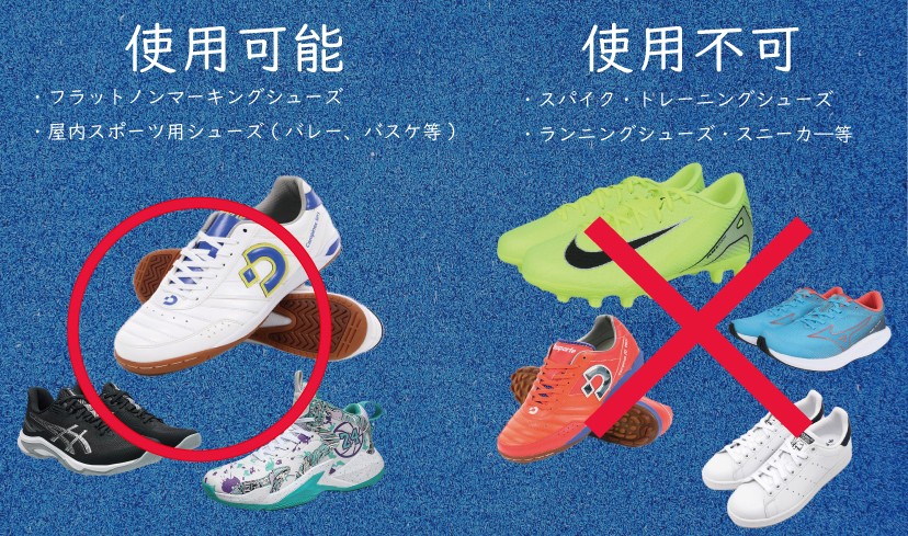 - プレーの際はインドア用ノンマーキングシューズをご使用ください。(トレーニングシューズ、スパイク、スニーカーなど使用不可)